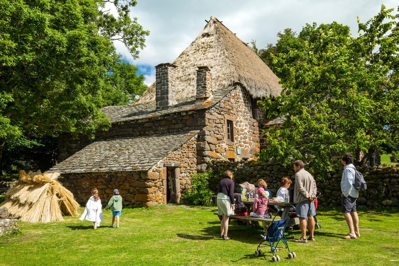 Entourée d’un muret pour se protéger de la neige et de la « burle », ce vent violent chargé de glace, la maison des plateaux a des allures de forteresse austère où la pierre est présente des fondations au toit (à l’exception des chaumières de Bigorre et de Moudeyres). Ses formes sont trapues (murs de 2 mètres), ses ouvertures petites et orientées en face sud. Un porche voûté, « l’arcasse », sert d’entrée commune aux hommes et aux bêtes ; une cloison de bois sépare l’étable du « carré » d’habitation. La maison est souvent réduite à une seule pièce comprenant lits-clos, placard, horloge, une table longue et deux bancs, sans oublier la cheminée, le « cantou ». Un escalier intérieur, conduit à la fenière qui occupe tout l’étage en raison de la grande quantité de fourrage nécessaire au bétail restant sept à huit mois dans l’étable.