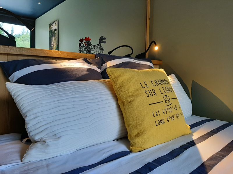 Chambre double (1 lit 2 pers. en 140x190 cm), avec sanitaires privatifs et attenants (douche grand format, vasque sur meuble et WC suspendus). Sèche-cheveux. Sèche-serviettes électrique. Produit d'accueil fourni (savon liquide corps-cheveux).