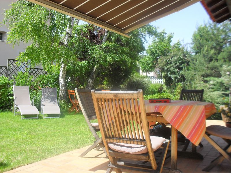 Terrasse située au 1er niveau de la maison, à partager avec les propriétaires (store banne, mobilier de jardin). Jardin fleuri et ombragé. Parking privatif fermé. Livres et jeux de société à disposition des locataires. Mise à disposition du garage sur demande (vélos, motos).