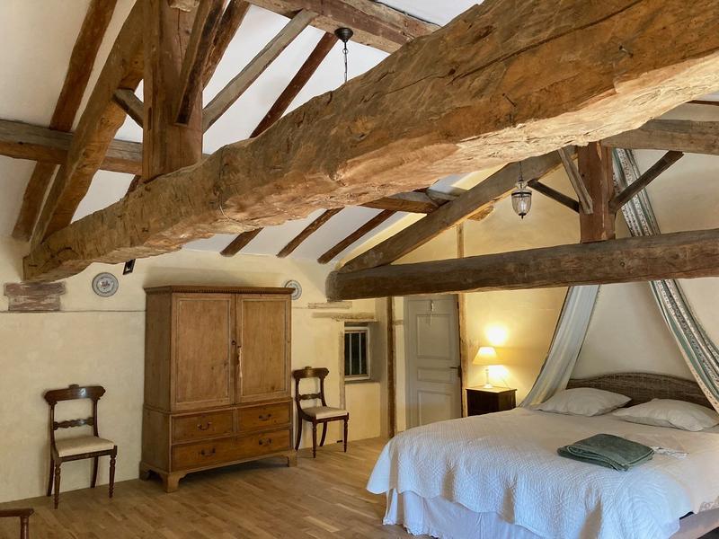 Chambre d’hôte de charme de 45 m2 avec poutres apparentes, située dans des jardins historiques, vue sur lauriers roses, bassin et jet d’eau. Coin salon, salle de bain et WC privatif, lit king size, décoration raffinée avec meubles anciens, wi-fi. Possibilité de rajouter un lit une place (prix en supplément). Petit déjeuner dans un couvert raffiné servi dans la salle à manger voûtée du manoir. Accès aux jardins et aux salons du manoir. Table de ping pong, transats, table de jardin. Parking gratuit sécurisé dans la propriété close de murs.