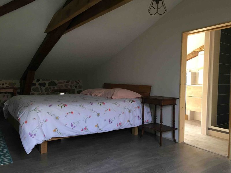 Grande chambre pouvant recevoir jusqu'à 4 personnes (possibilité de 2 places supplémentaires pour des enfants) avec entrée indépendante et salle de bain privée. L’espace est meublée avec deux lits doubles ( un queen size et un 140). Salle de bain privée avec douche, lavabo et toilettes, et vue sur la campagne environnante.
