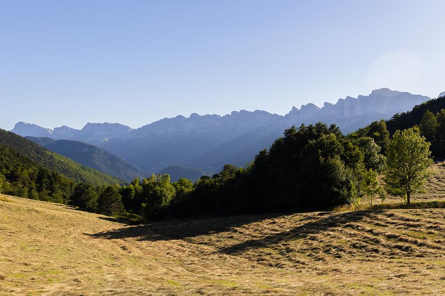 Grande terrasse et Pergola ombragée par toile de camouflage donnant sur grand jardin avec vue sur les dentelles du Vercors et possibilité de prolonger l'instant, dans des chaises longues.