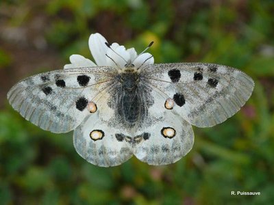 Espèce montagnarde de couleur blanche, elle présente deux tâches noires dans la cellule de l’aile antérieure. Elle est présente entre 900 et 2000 m d’altitude et affectionne les formations herbacées riches en fleurs ou les prairies de fauches. Espèce menacée, elle est inscrite sur la liste des insectes protégés.